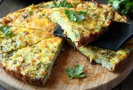 Vajíčka si zmiešame v miske, so soľou, korením, pažítkou a vňaťou. Jarnú cibuľku vložíme do rozpálenej panvice a krátko restujeme, Papriky a sušenú paradajku nakrájame na drobné kúsky a orestujeme na cibuľke. Po chvíli zalejeme vajíčkovou zmesou a pečieme. Nalámeme do vajíčok slaný syr na väčšie kocky. Asi po 4 minútach si vezmeme tanier,...